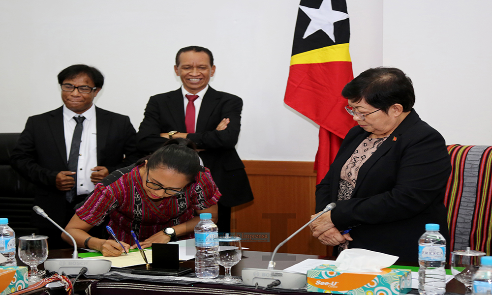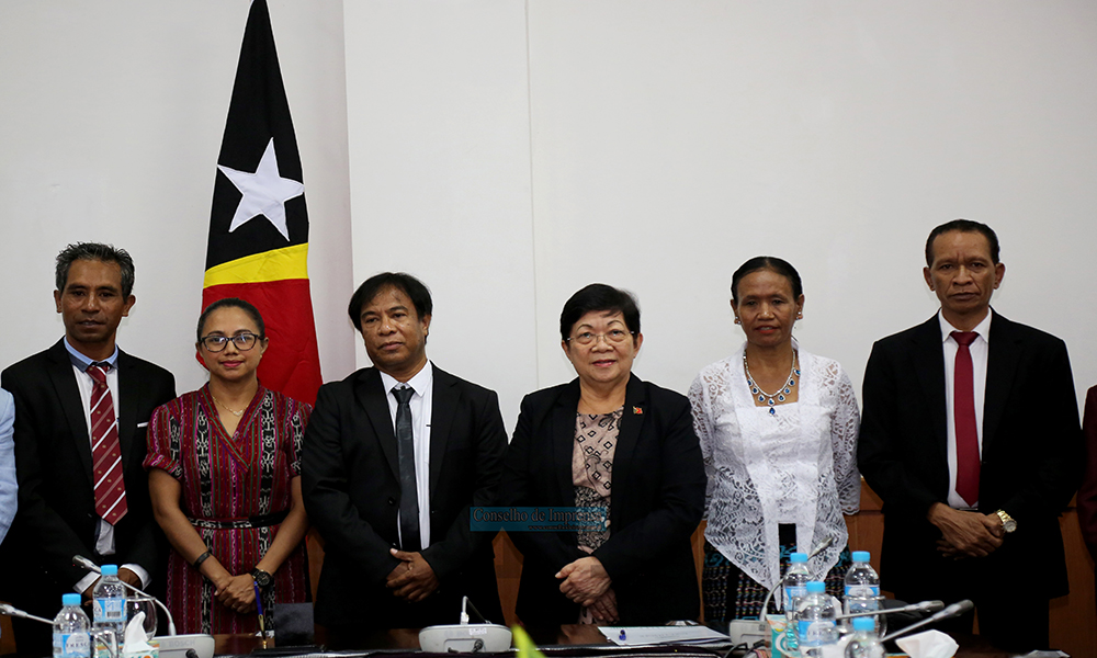 Dili – Prezidente no Membru Conselho de Imprensa de Timor-Leste (CITL) terseiru mandatu ba períodu 2025-2029, simu pose husi prezidente Parlamentu Nasional, Maria Fernanda Lay, iha salaun konferénsia Parlamentu Nasionál, iha loron 26 Juñu 2025.